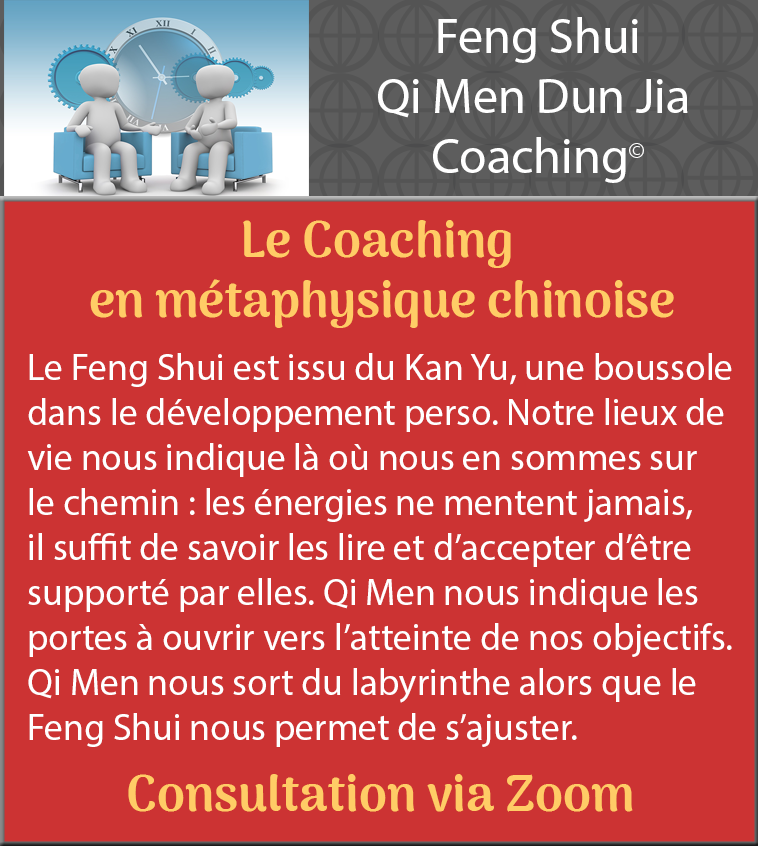 Pour bénéficier de cette forme de coaching, l'analyse Feng Shui de la demeure est un préalable. Par la suite, des rencontres sont planifées, à la carte, pour aider à lever les blocages chez l'individu qui consulte. Le BaZi et certains atouts du Qi Men Dun Jia font partie des ressources. La Kinesthésie holistique et intégrale© est aussi l'approche utilisée dans cette démarche puisqu'elle offre la possibilité de lever les blocages causés issus des liens de cause à effets.