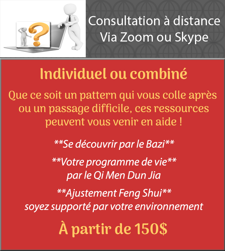 Que cet objectif soit relationnel, qu'il tienne de l'atteinte d'un objectif ou pour vous dépasser, les ressources et la façon d'y arriver que vous offre le Qi Men Dun Jia restent simples à appliquer et très efficace. Aucune situation ne devrait être vu sous l'angle de la fatalité.