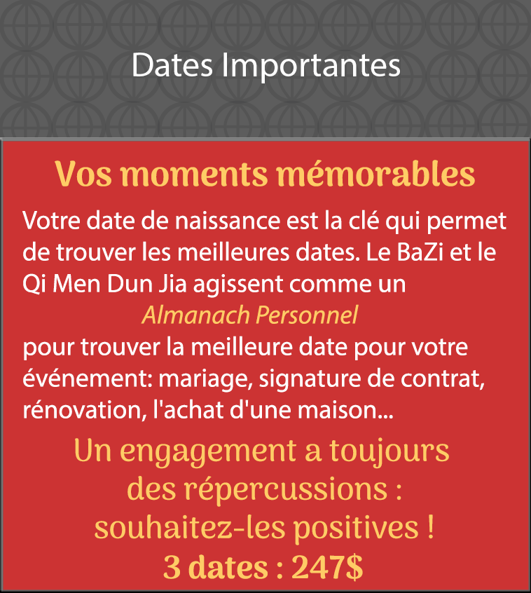 Le 'timing' a un impact sur l'humain et sa réussite. Plutôt de laisser les autres ou le hasard choisir ce moment pour vous, il vous est offert la possibilité de planifier la meilleure date à choisir pour vos événements importants.