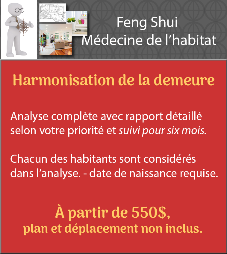 Dans cette démarche, la lecture rapide de trois lieux et la l'analyse de base de la nouvelle demeure sont incluses. Les tarifs sont en relation avec l'importance de l'habitation, sa complexité et le nombre de personnes qui l'habiteront - frais de déplacement en sus.
