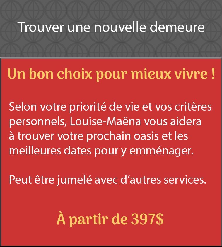 Le premier pas est d'établir votre priorité. Ensuite, à partir de celle-ci nous pourrons regarder quelle est l'orientation la plus favorable pour vous et dans quelle direction trouver cette future demeure (en relation avec la présente habitation); soutenir la recherche de votre prochaine demeure vous épargnera temps et argent : votre budget sera le même pour un lieu qui vous convient que pour un lieu qui vous sabotte sans tous les inconvénients !
